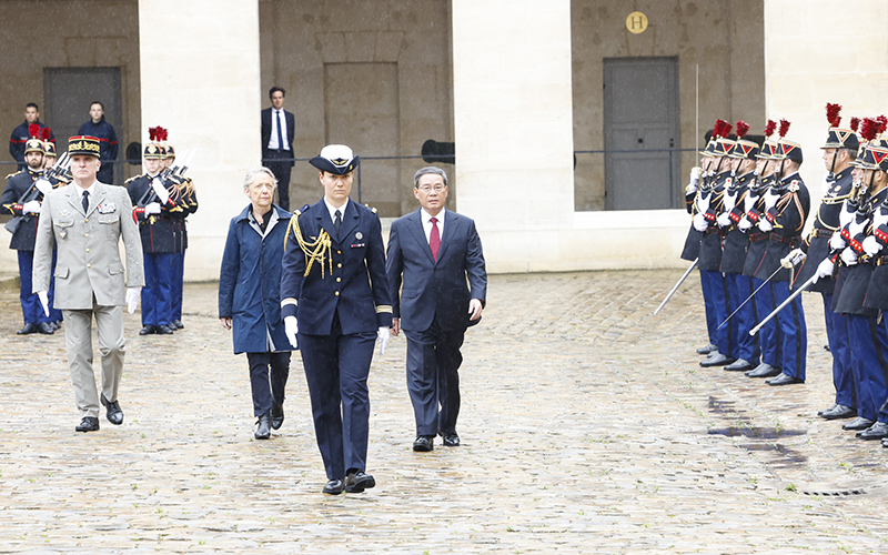 会谈前,博尔内在法国荣军院为李强举行隆重的欢迎仪式。荣军院广场升起中法两国国旗。军乐队高奏中法两国国歌。李强在博尔内陪同下检阅了共和国卫队。
